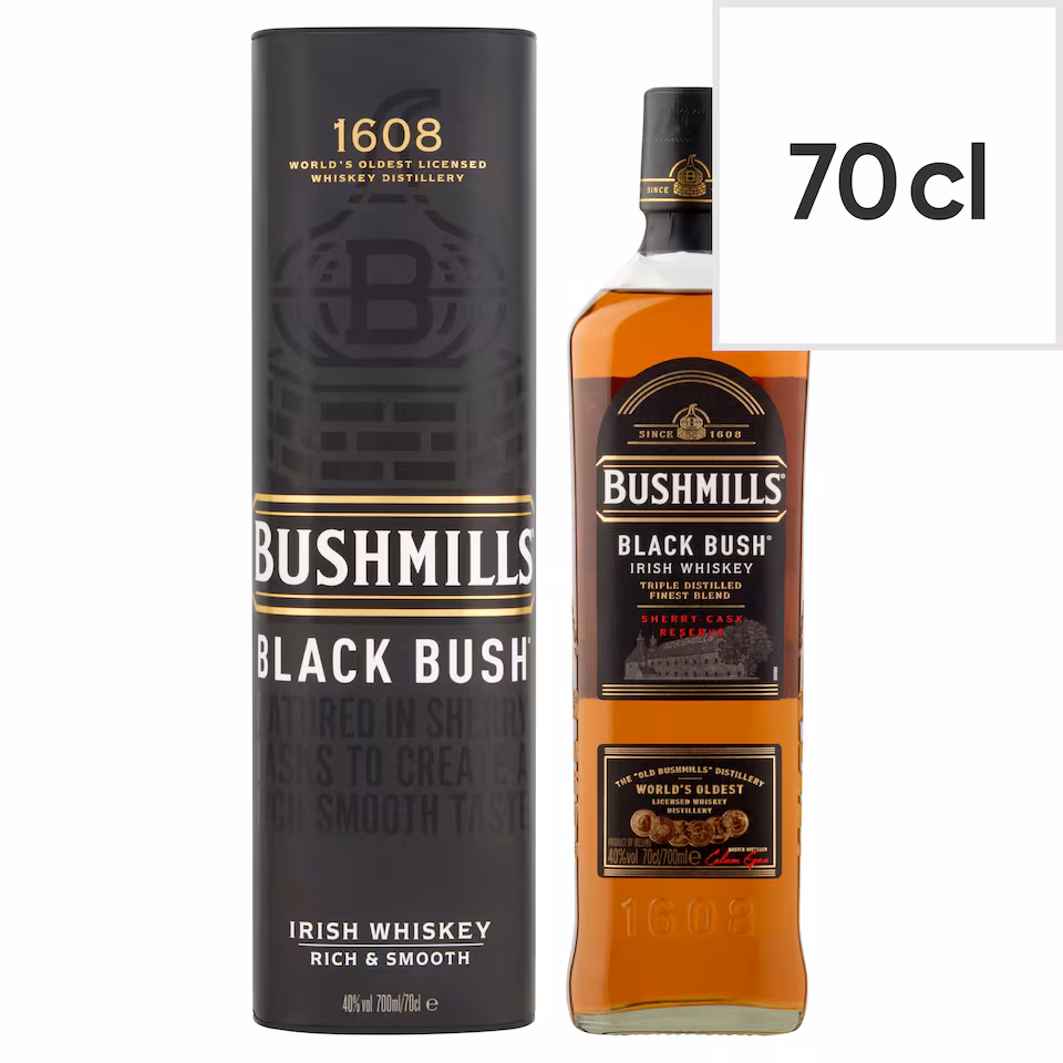 Bushmills Black Bush Irish Whiskey 70cl is offered at saveandgo.co.uk as a single bottle release that showcases one of the most historic Irish whiskey styles still produced today. This whiskey is considered the flagship blend of the Bushmills range and is admired for its unusually high proportion of single malt whiskey, aged mainly in oloroso sherry casks.