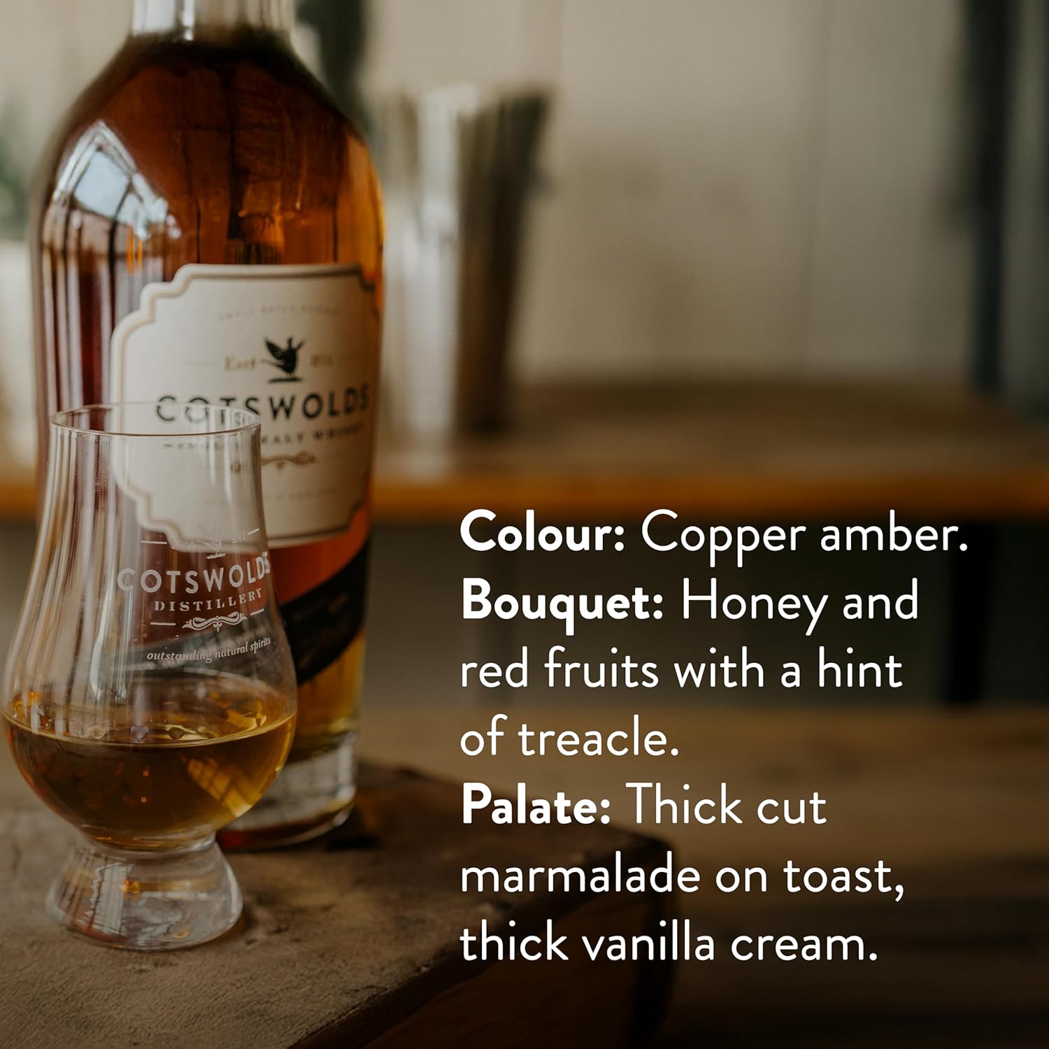 Crafted using 100% locally grown Cotswolds barley, this single malt is produced at the Cotswolds Distillery, nestled among the rolling hills of the English countryside. Traditional floor-malted barley is distilled with care, then matured in a distinctive combination of STR (Shaved, Toasted, Recharged) red wine casks and first-fill American bourbon barrels.