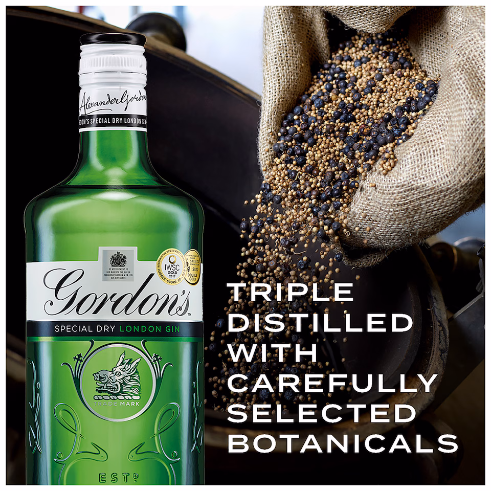 Crafted using a closely guarded recipe, Gordon’s Special Dry Gin blends handpicked wild juniper berries with coriander, angelica, and liquorice. Triple-distilled to guarantee exceptional purity, it delivers a clean, dry flavour with balanced botanicals that define the perfect Gin & Tonic.