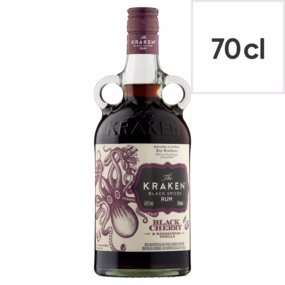 Kraken Black Spiced Rum Black Cherry & Vanilla combines the bold character of Kraken’s signature Caribbean black spiced rum with the rich, fruity sweetness of black cherries and the smooth, creamy depth of Madagascan vanilla. This blend creates a dark, flavourful rum with a balance of sweetness, warm spice, and a slightly smoky undertone that Kraken is known for.